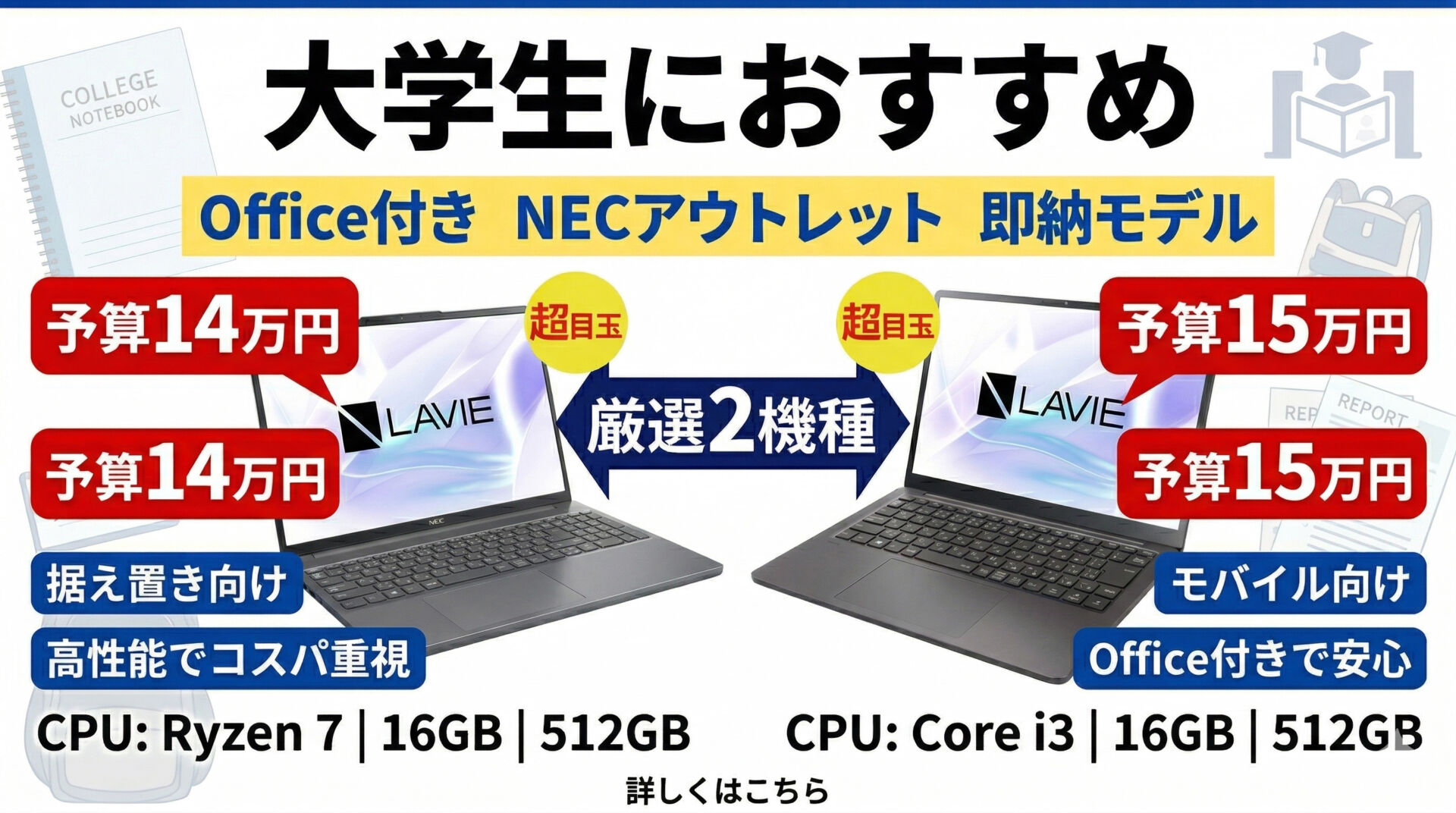 NECのアウトレット即納モデルの中から、大学生におすすめしやすい2機種を厳選してまとめました。