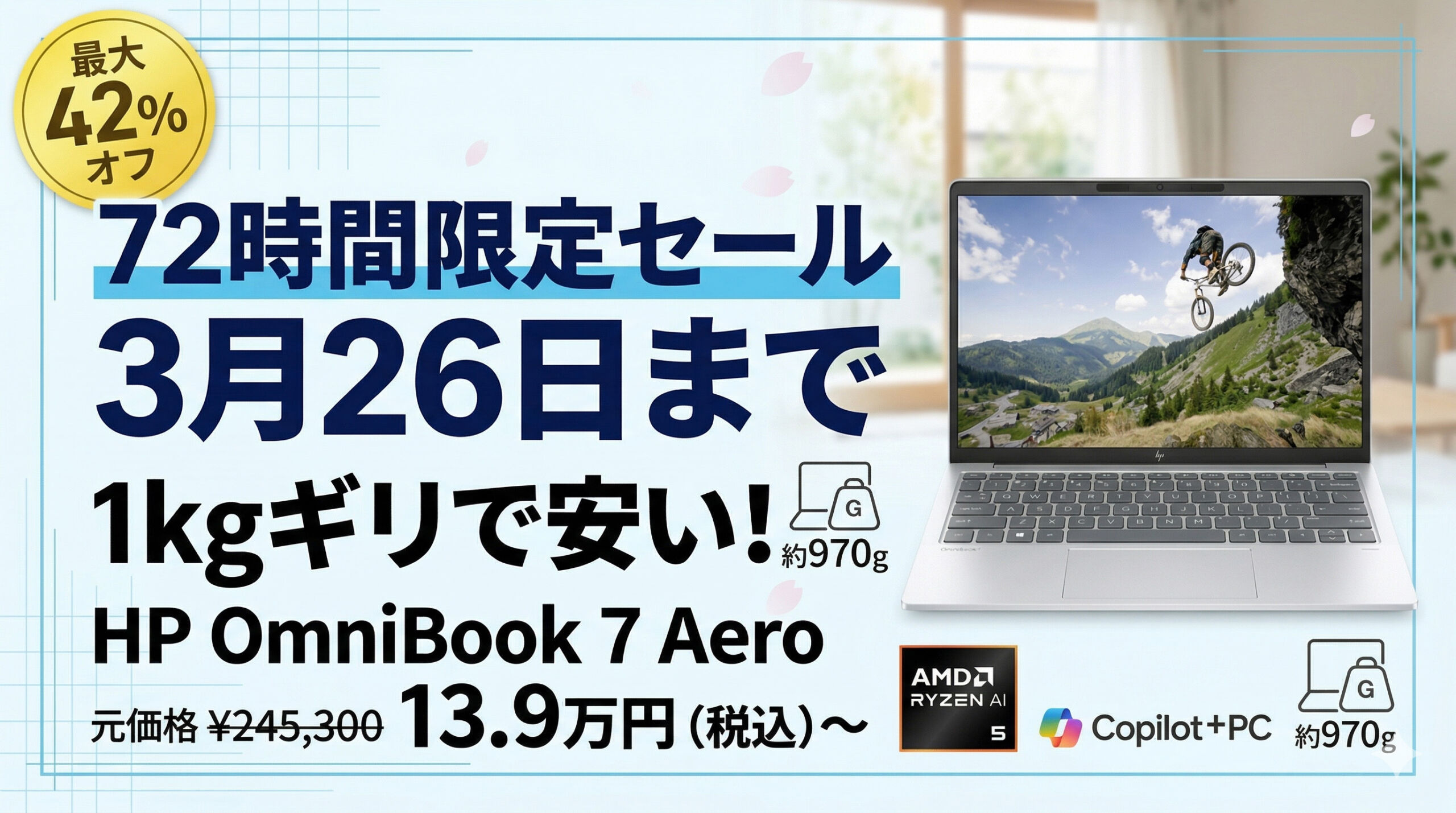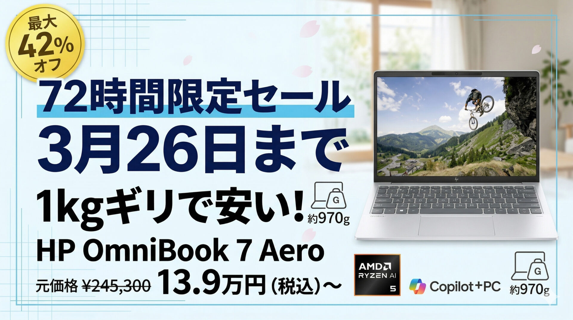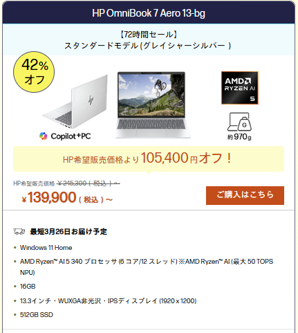 HPの軽量モバイルノートPC「HP OmniBook 7 Aero 13-bg」が、3月26日までの72時間限定セールで139,900円(税込)から販売されています。
