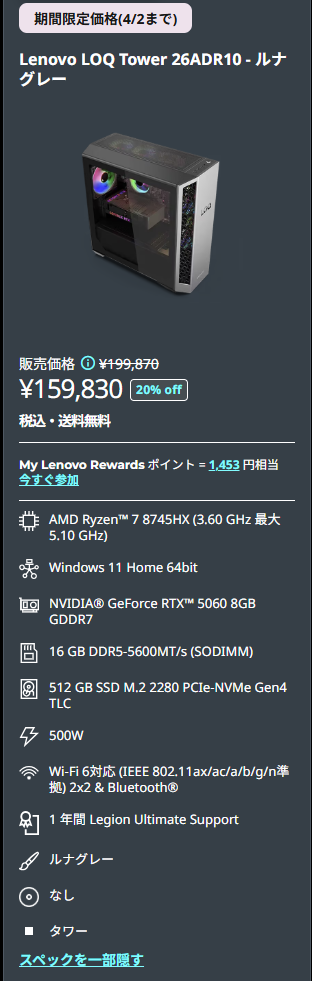 4月2日まで開催中のレノボセールで、Ryzen 7 8745HXとRTX 5060を搭載したゲーミングデスクトップPCが159,830円で販売されています。