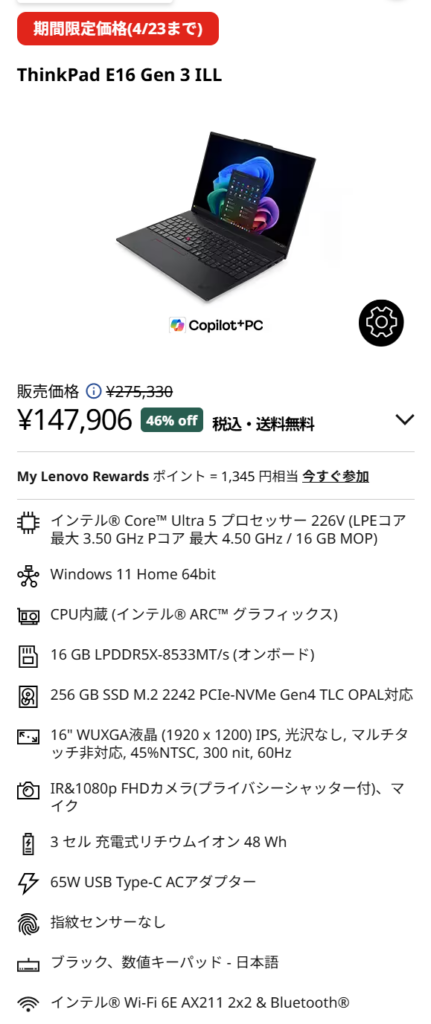 特に良いのは、16型の見やすい画面とThinkPadらしい使いやすさを比較的安く確保できることです。