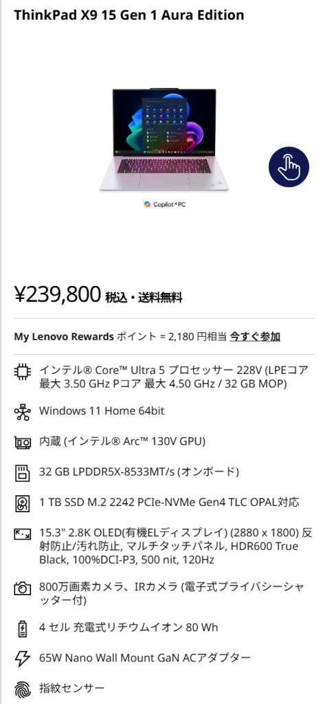なぜなら、32GBメモリ・1TB SSD・15.3型 2.8K OLED搭載で239,800円だからです。