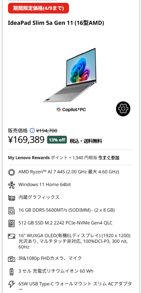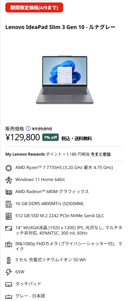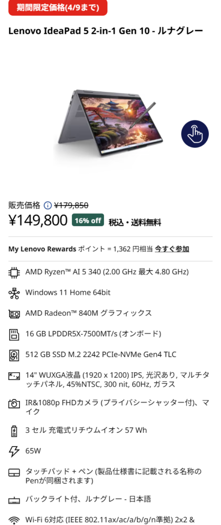 4月9日までのレノボのセールでは、10万円台前半から16万円台までで狙いやすいノートPCがいくつかあります。