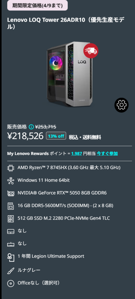 4月9日までのレノボのセールでは、Lenovo LOQ Tower 26ADR10がかなり面白い価格帯に入っています。