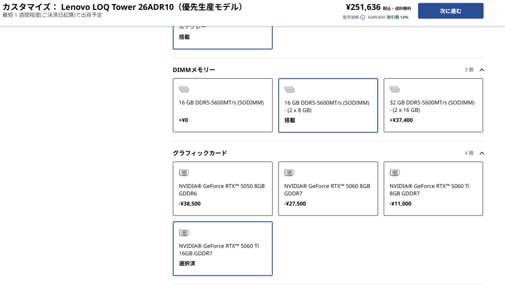 そこからカスタマイズでRTX 5060 Ti 16GBを選択しても、合計251,636円に収まっています。