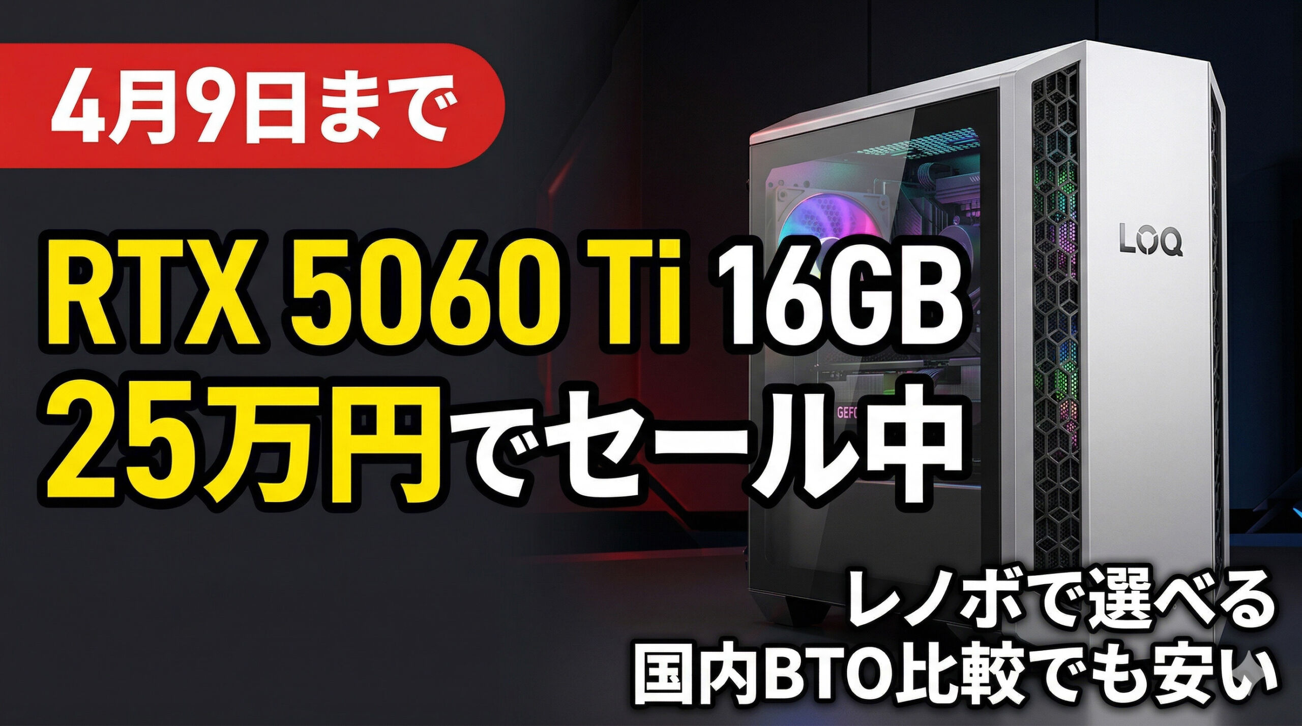 などがあるため単純比較はしにくいものの、少なくとも今回のLOQ Tower 26ADR10は、25万円台前半でRTX 5060 Ti 16GB構成にできる時点でかなり競争力があります。
