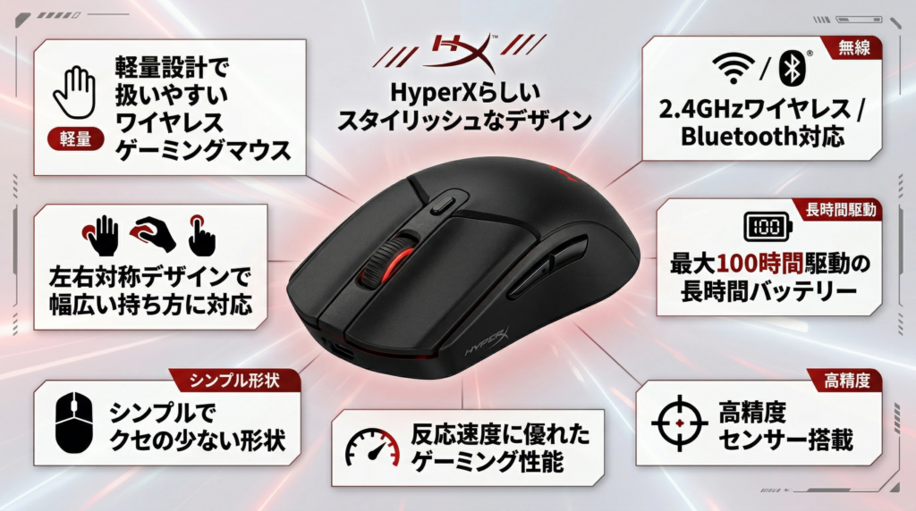 HyperX Pulsefire Haste 2 Core Wirelessは、軽量設計とワイヤレス性能を手頃な価格で実現したコストパフォーマンスの高いゲーミングマウスです。