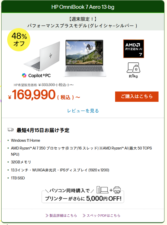 今回安くなっているのは、HP OmniBook 7 Aero 13-bg パフォーマンスプラスモデルです。日本HPの週末限定タイムセールでは、HP希望販売価格333,300円からに対して、169,990円からと案内されており、割引率は48%オフと表示されています。最短お届け予定も4月15日となっているため、4月前半に新生活用や仕事用のPCを用意したい人にもタイミングは悪くありません。