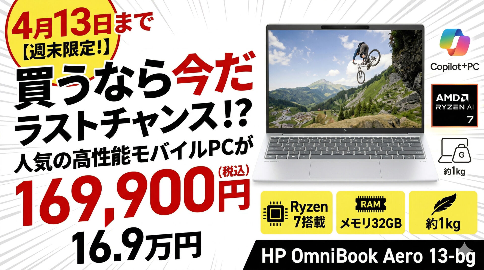 日本HPの週末限定タイムセールで、HP OmniBook 7 Aero 13-bgのパフォーマンスプラスモデルが税込169,990円からになっています。セールページでは2026年4月13日 12:59までのキャンペーンとして案内されており、構成はRyzen AI 7 350 / 32GBメモリ / 1TB SSD / 13.3型 WUXGA IPSと、かなり実用性の高い内容です。さらに日本HPのセールページでは、このモデルを約970gの超軽量モバイルノートPCとして打ち出しています。