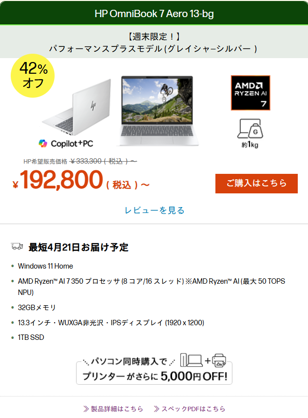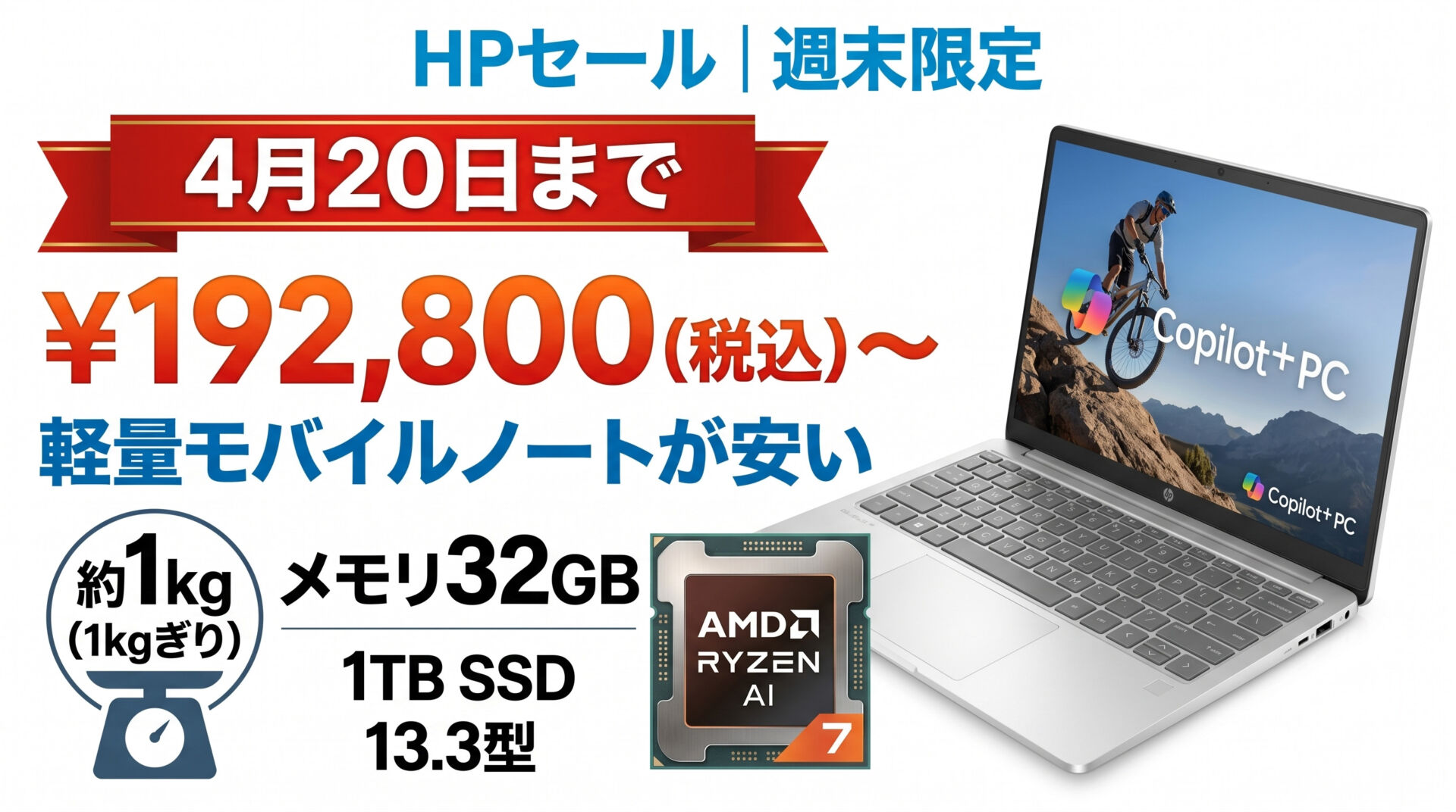 4月20日までの期間限定で、HP OmniBook 7 Aero 13-bgがセール価格で販売されています。