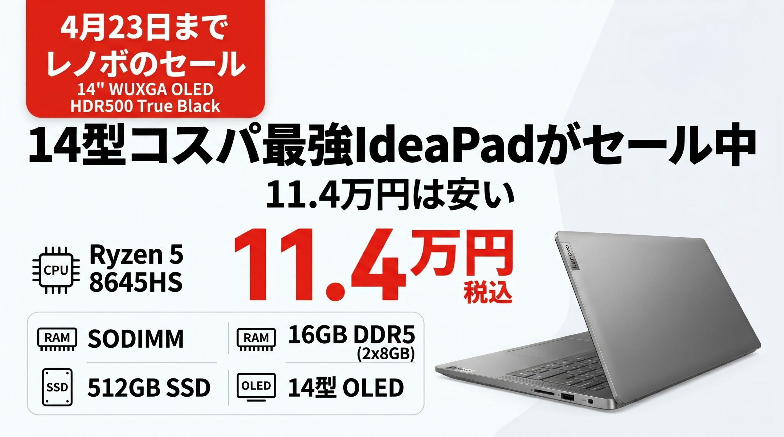 ホームセール4月23日までLenovo IdeaPad Slim 5 Gen 10(14型 AMD)が実質11.1万円前後で狙いやすい