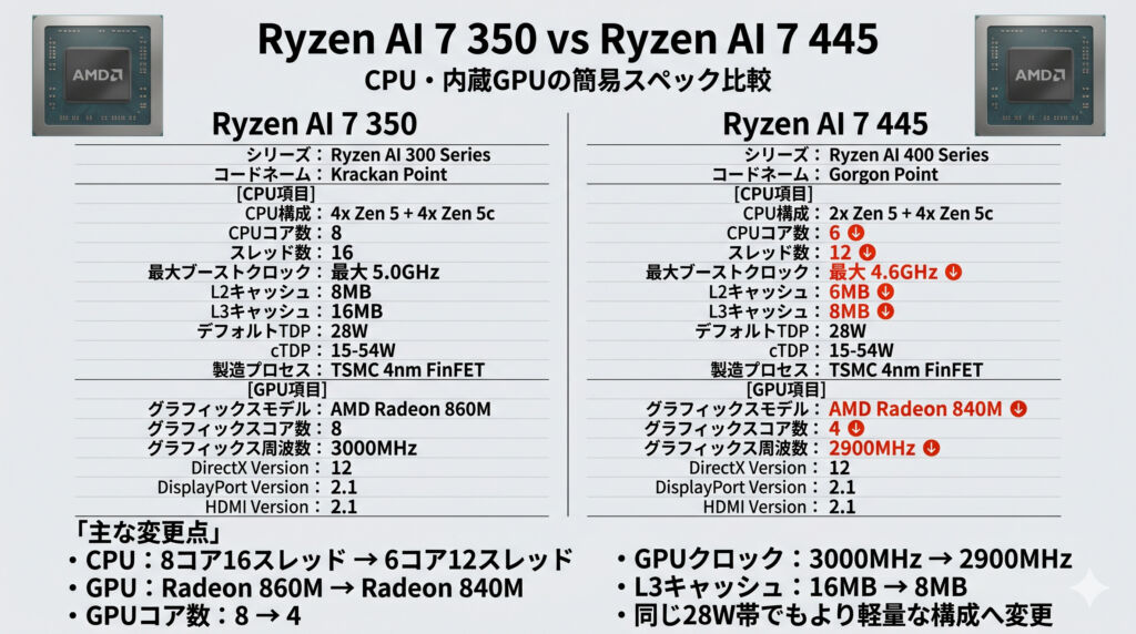 Ryzen AI 7 350からRyzen AI 7 445になって何が変わったのかというと、CPUコアが8コアから6コアになり、GPUに搭載されているコアも8コアから4コアへ削られました。