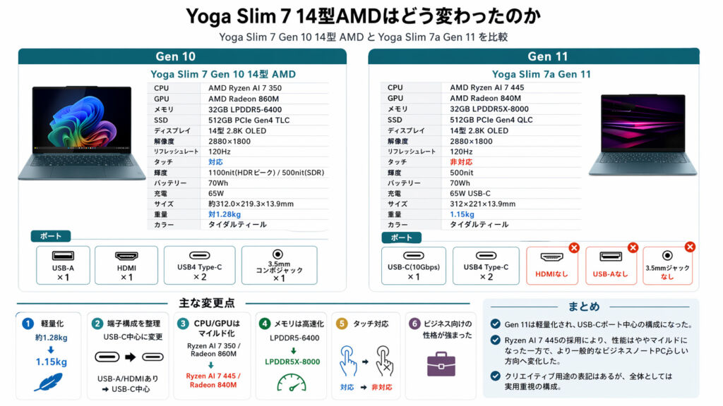 Yoga Slim 7 Gen 10 14型AMDとYoga Slim 7a Gen 11を比較する。