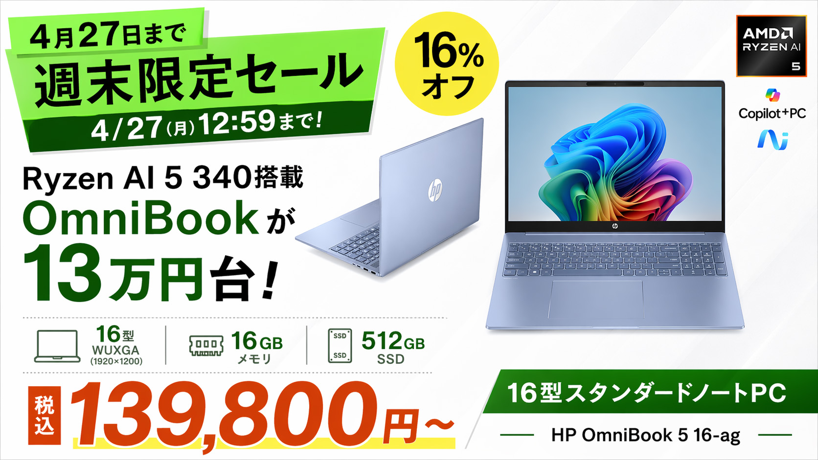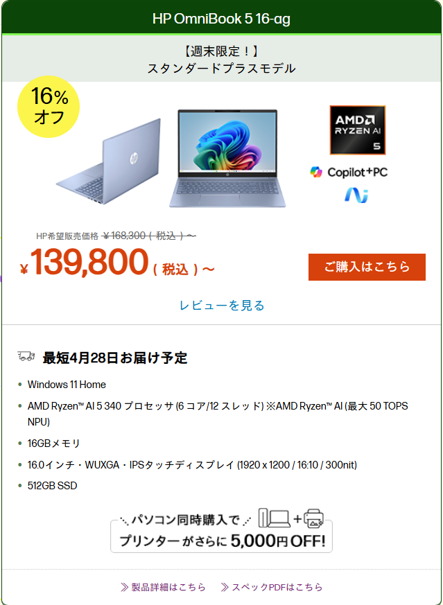 日本HPの週末限定セールで、HP OmniBook 5 16-agが特別価格で販売されています。