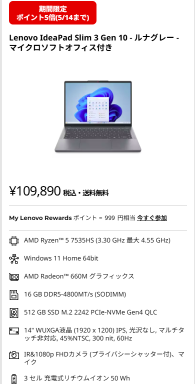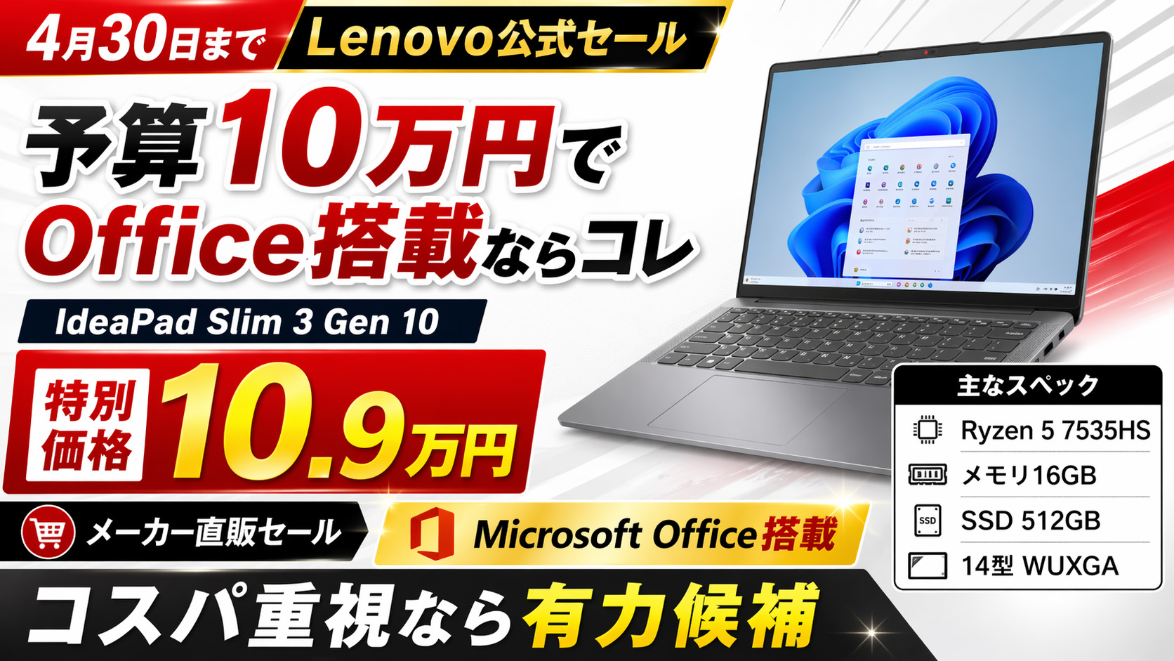 Lenovo IdeaPad Slim 3 Gen 10は、税込109,890円で、Ryzen 5 7535HS、メモリ16GB、512GB SSD、14型WUXGA液晶、さらにMicrosoft Officeまで搭載した実用重視のノートPCです。